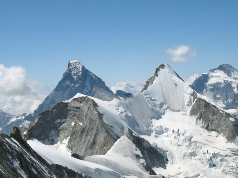 La face Nord de l'Obergabelhorn (sommet du milieu, entre le Pic Chaussy et les Monts Chevreuils), une face glaciaire condamnée à disparaître suite aux trop nombreuses marches taillées ces dernières années